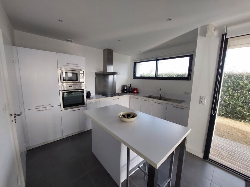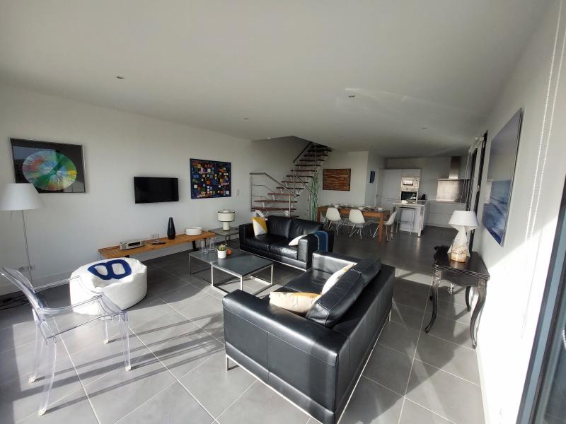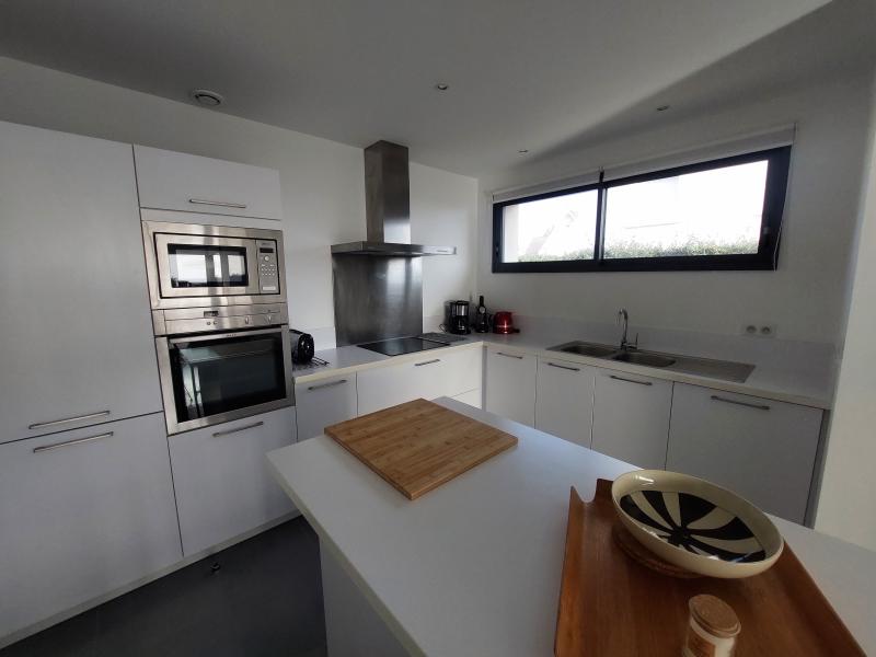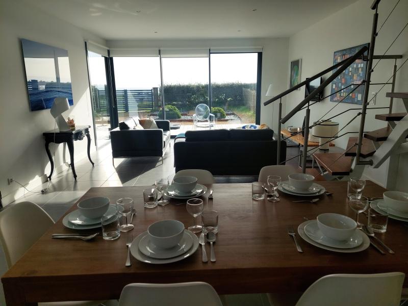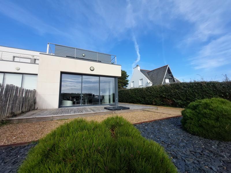 Beautiful 144m² designer villa (2013) facing south on a 400m² walled garden. Situated in front of the Teven beach, the walking path running between the villa and the beach. Car port for parking cars at the back of the house.
