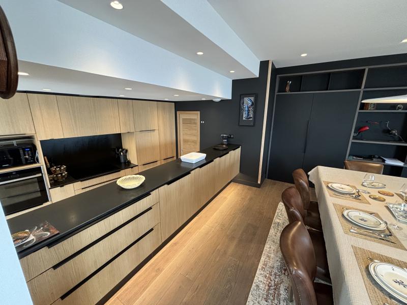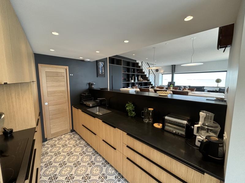 Spacious living area with a fully equipped kitchen, dining space, and elevated lounge with breathtaking sea and beach views