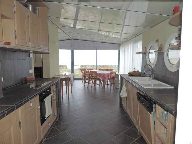 – Living-room with fitted kitchen area, dining area opening onto terrace and garden facing ocean.